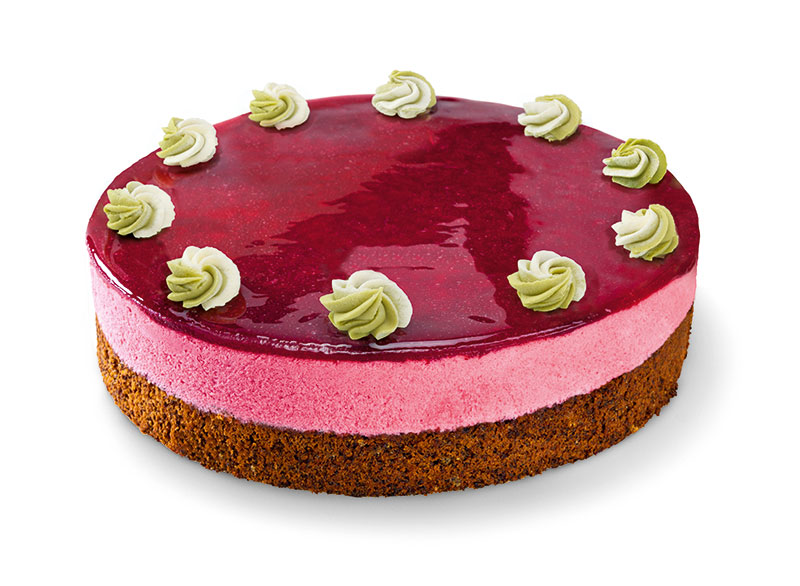 Himbeermousse auf einem flaumigen Mohnboden, mit Himbeerglasur überzogen und Gelee abgeglänzt. Dekoriert mit Buttercreme, grüner Schokolade und hausgemachtem Himbeer-Gelee.