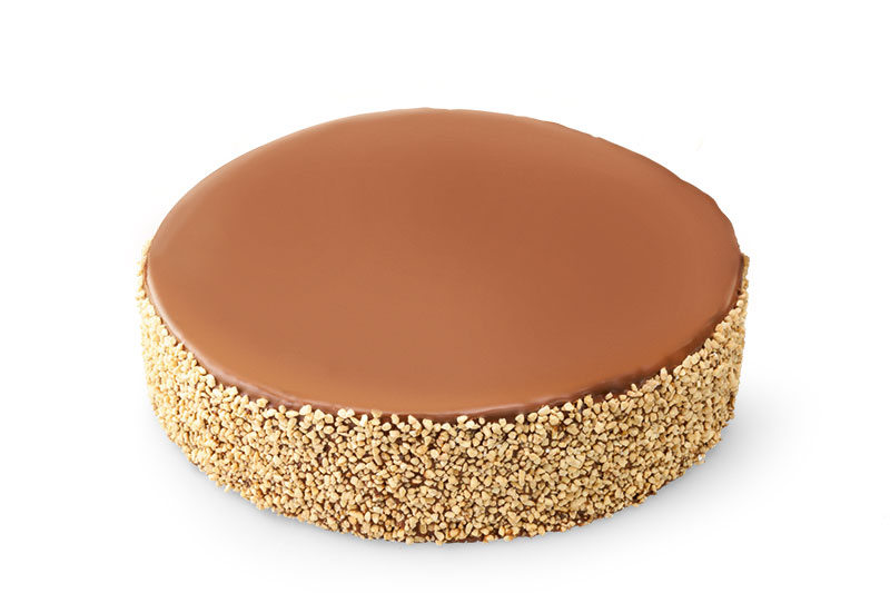 Leichte Milchparisercreme in Sacherböden mit einer Glasur aus Milchschokolade und Nougat, mit hauchdünner Schokolade dekoriert.